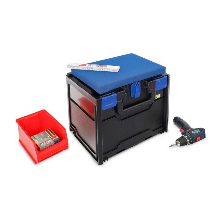 praktische Montagebox mit Sitzgelegenheit für Arbeiten in sonst gebückter Haltung oder Ihrer