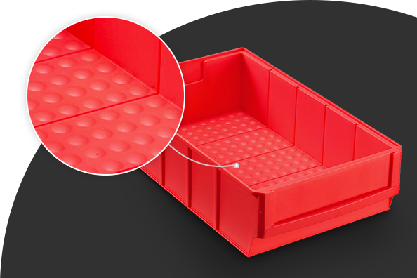 Auf dem Boden der Industriebox sind praktische Bodennoppen angebracht, wodurch die Aufnahme von Kleinteilen (z.B. Unterlegscheiben, usw.) durch die erhobenen Bodennoppen in den Kunststoffkisten verbessert wird.