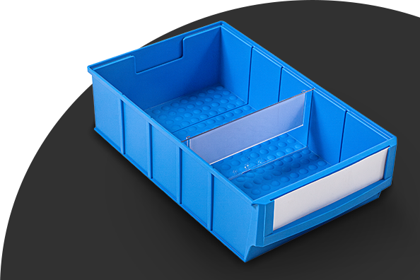 Industrieboxen gleicher Breite (entweder 183 mm oder 91 mm) sind auch bei unterschiedlichen Längen (z.B. 300 mm, 400 mm sowie 500 mm) aufeinander stapelbar. Die außenliegenden Fixierungen der Trennstege verringern das Verletzungsrisiko beim Herausnehmen von Teilen.