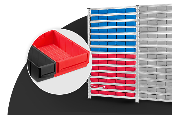 Maximale Regalnutzung – Die immer gleiche Höhe von 81 mm bei allen Industrieboxen-Größen ermöglicht die effektivste Nutzung jedes Regalträgers.