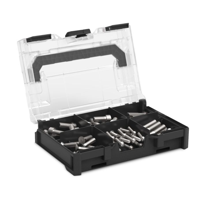 Die metaBOX mini 63 XS BLACK EDITION ist ein platzsparender Kleinteilekoffer, der sich besonders für den Transport und die Aufbewahrung kleinerer Mengen von Schrauben, Unterlegscheiben und andere Komponenten eignet. Zudem ist sie ideal als Pflasterbox für kleine Missgeschicke geeignet. Der transparente Deckel ermöglicht es, den Inhalt der Box direkt zu sehen. Durch das ausgeklügelte Verkopplungssystem können mehrere Boxen der metaBOX mini 63 XS miteinander verbunden werden. Die kleine metaBOX mini 63 XS kann ebenfalls ganz praktisch und einfach auf den großen metaBOXen angebracht werden. Mehrere metaBOXen 63 XS können ebenfalls mit einander verbunden und transportiert werden. Die metaBOX 63 XS steht aktuell nur in der BLACK EDITION zur Verfügung
